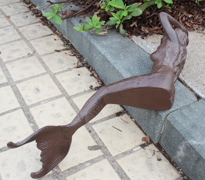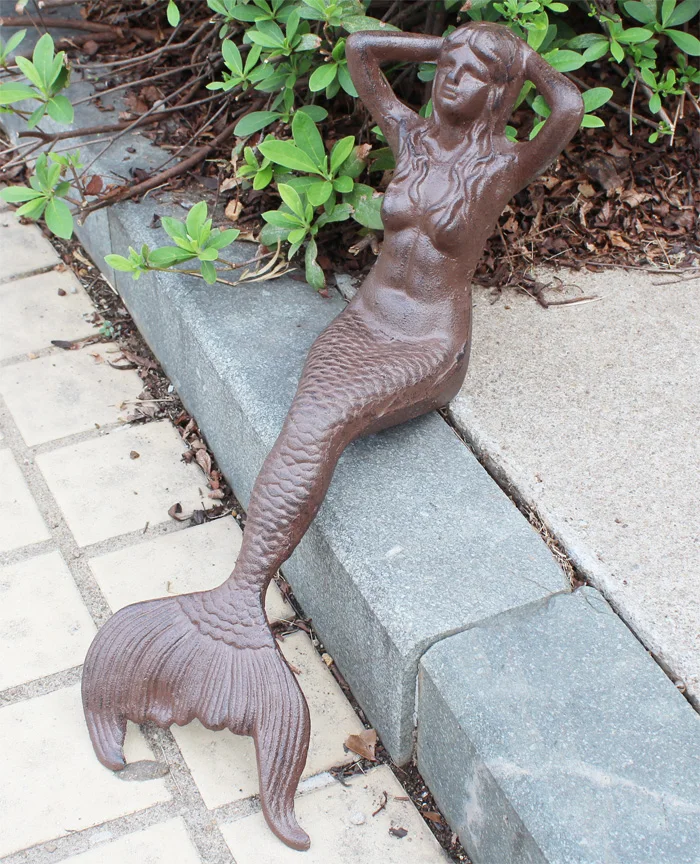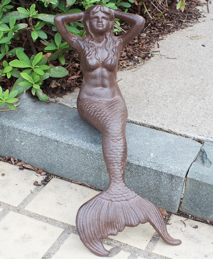 Special Cast Iron Mermaid Shelf Sitter Rust Finish Sitting Sunning Mermaid Statue Home Courtyard Garden Hot