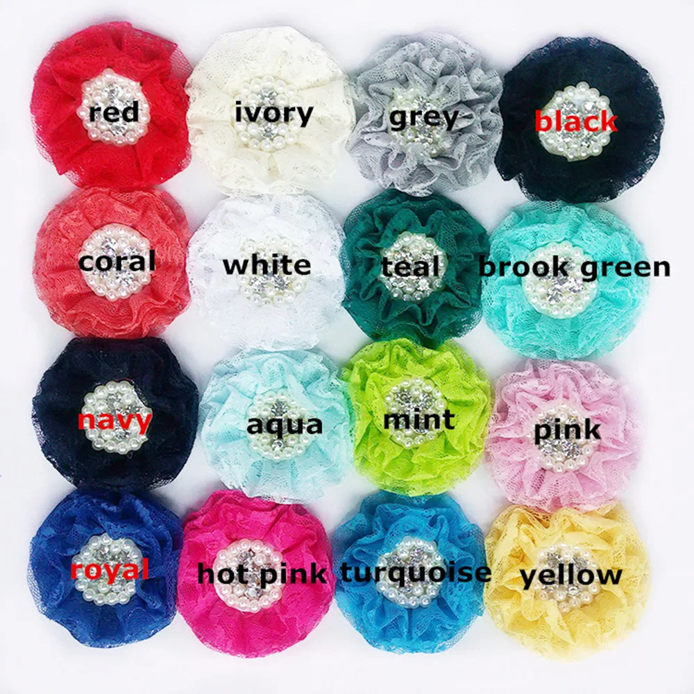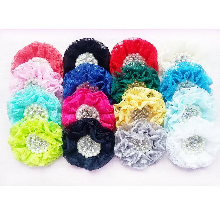New Arrival 30 pcs/lot 8cm '' lace fabric pearl and rhinestone flowers lace flowers for hair apparel accessories